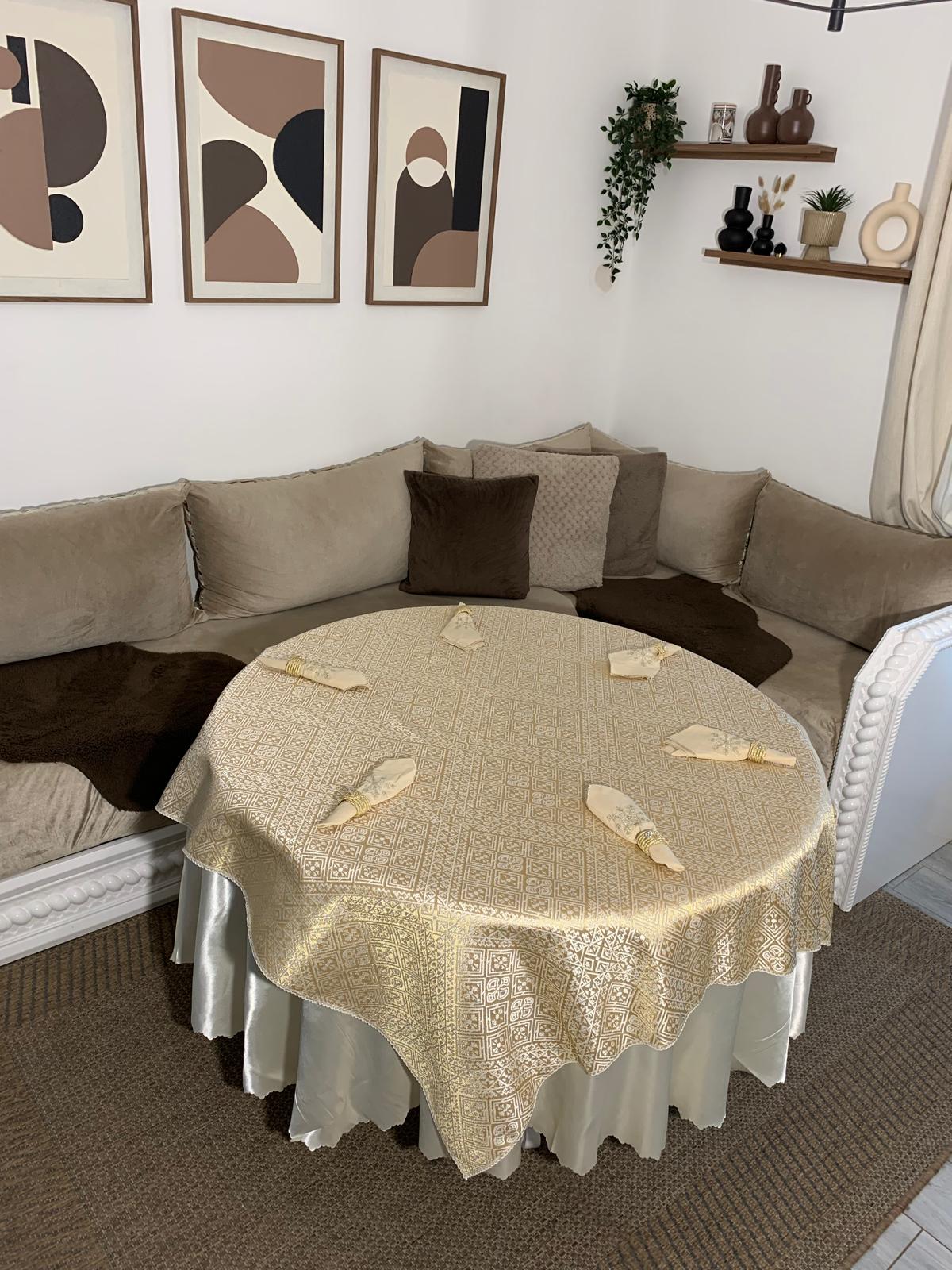 Sublimez votre table avec cette magnifique nappe traditionnelle en tissu brocard “Khrib”, symbole d’élégance, de raffinement et de savoir-faire artisanal. Confectionnée avec un tissu de qualité supérieure, cette nappe transformera vos repas du quotidien et vos grandes occasions en véritables moments de convivialité et de prestige.